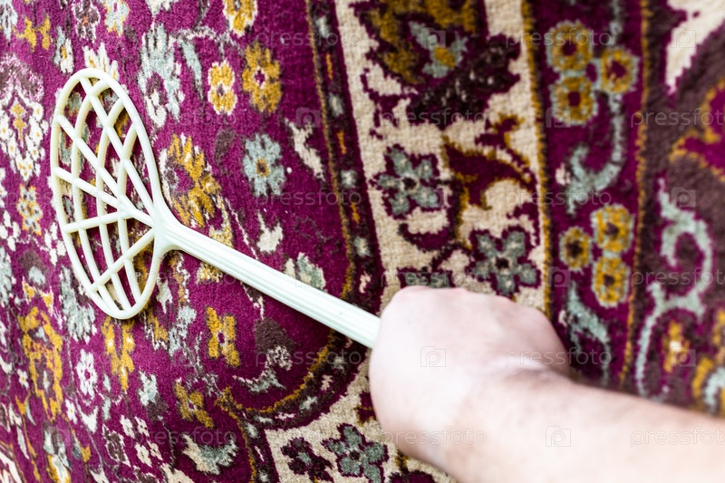 Выбивалка вытряхивает пыль из винтажного фиолетового ковра