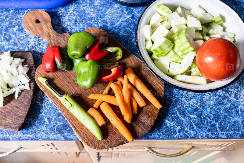 Очищенные, нарезанные овощи, подготовленные для тушения