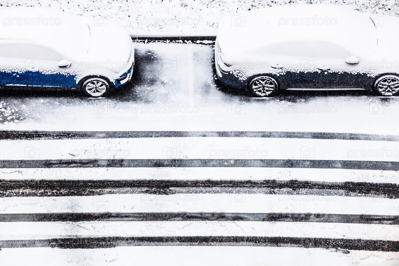 Вид сверху на следы автомобилей на заснеженной дороге