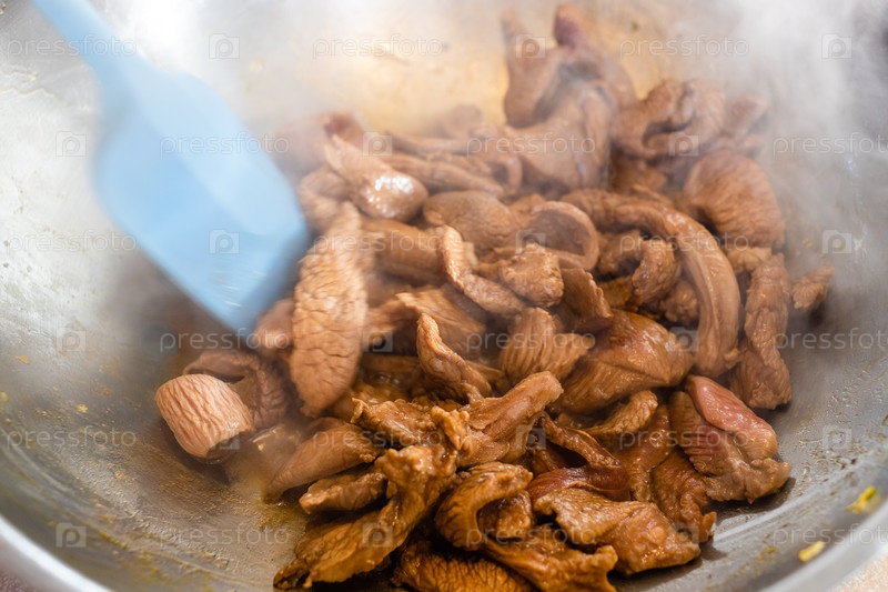 Перемешивание жареного мяса в воке силиконовой лопаткой
