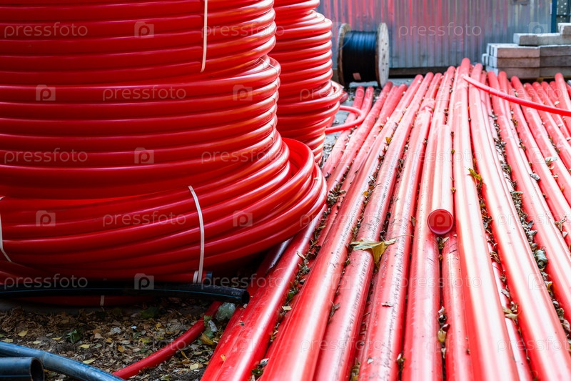 Новые красные пластиковые трубы для кабелепроводов на открытом складе