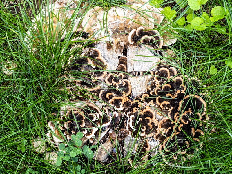 Грибы траметес на срезанном пне грушевого дерева крупным планом