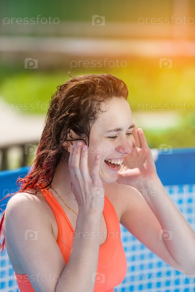 Молодая девушка смеется в бассейне