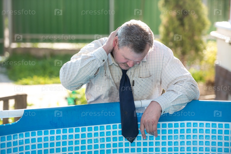 Красивый мужчина в деловом костюме умывается у бассейна. Летняя жара