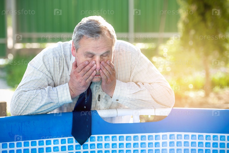 Красивый мужчина в деловом костюме у бассейна