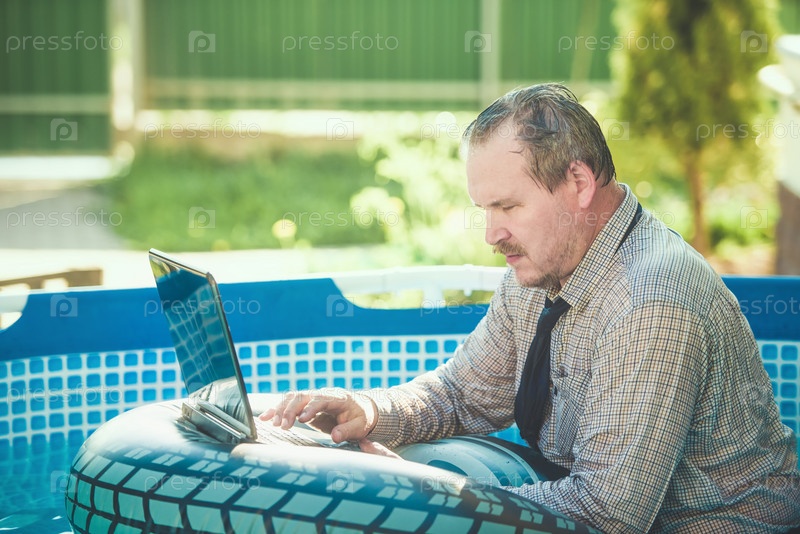 Деловой человек с ноутбуком работает на открытом воздухе у бассейна