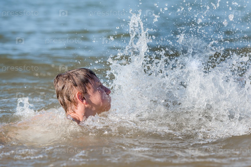 Мальчик-подросток плавает в брызгах воды — концепция пляжного отдыха