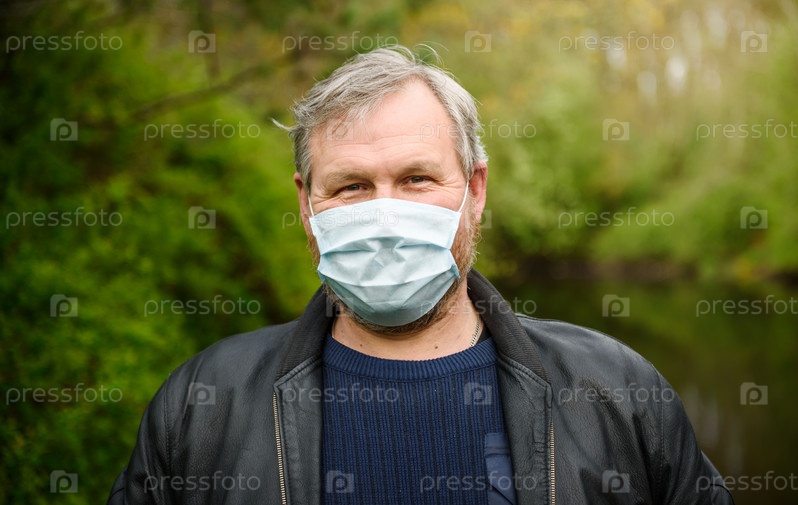 Счастливый мужчина в медицинской маске на прогулке у реки радуется окончанию карантина