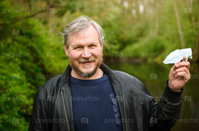 Счастливый мужчина средних лет снимает с лица медицинскую маску в весеннем парке. Из-за коронавируса. Конец пандемии, эпидемии и карантина