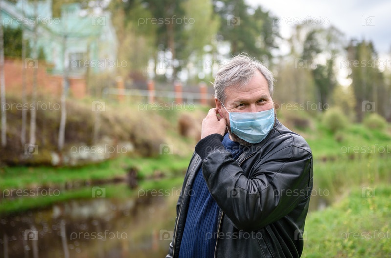 Счастливый мужчина на прогулке у реки. Мужчина снимает медицинскую маску с лица