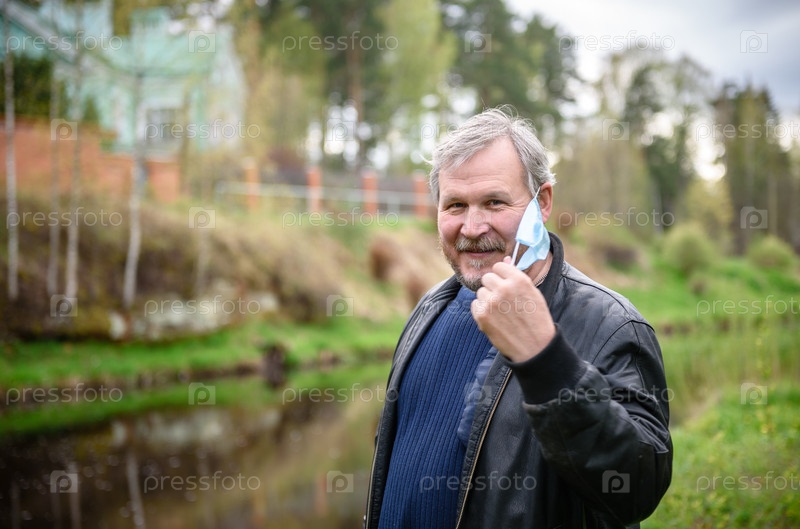 Счастливый мужчина на прогулке у реки. Мужчина снимает медицинскую маску с лица