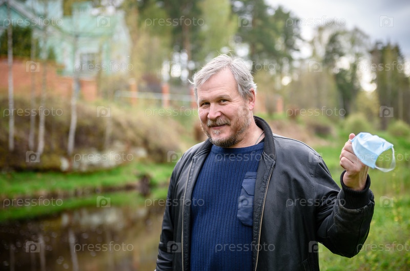 Счастливый мужчина средних лет снимает с лица медицинскую маску в весеннем парке. Из-за коронавируса. Конец пандемии, эпидемии и карантина