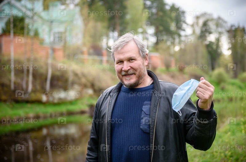 Счастливый мужчина средних лет снимает с лица медицинскую маску в весеннем парке. Из-за коронавируса. Конец пандемии, эпидемии и карантина