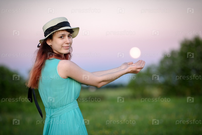 Красивая девушка в поле на фоне неба с луной