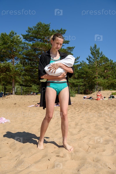 Молодая мать с младенцем на пляже у озера летом