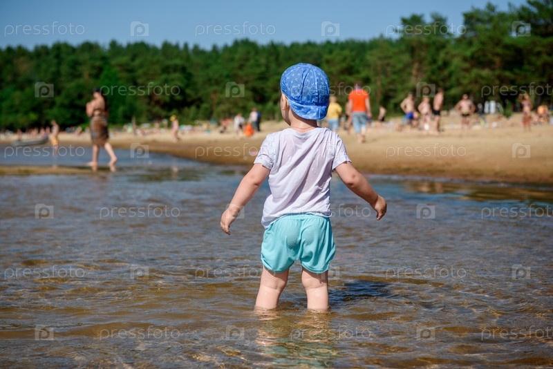 Маленький ребенок мальчик на речном пляже летом