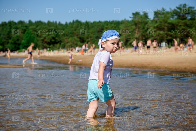 Маленький ребенок мальчик на речном пляже летом