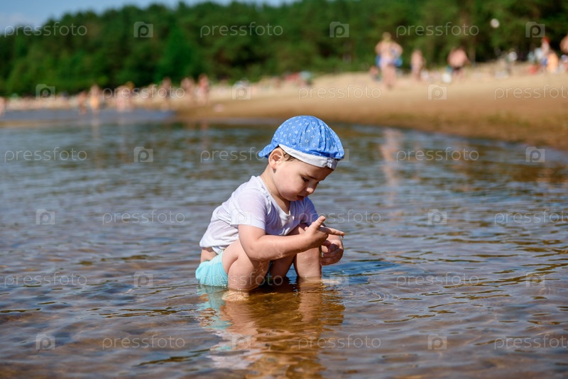 Маленький ребенок мальчик на речном пляже летом