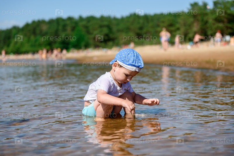 Маленький ребенок мальчик на пляже у большого озера