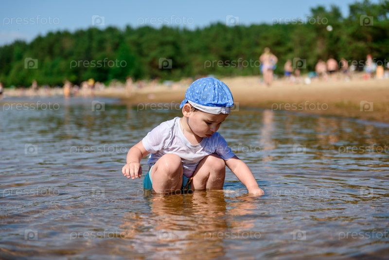 Маленький ребенок мальчик на речном пляже летом