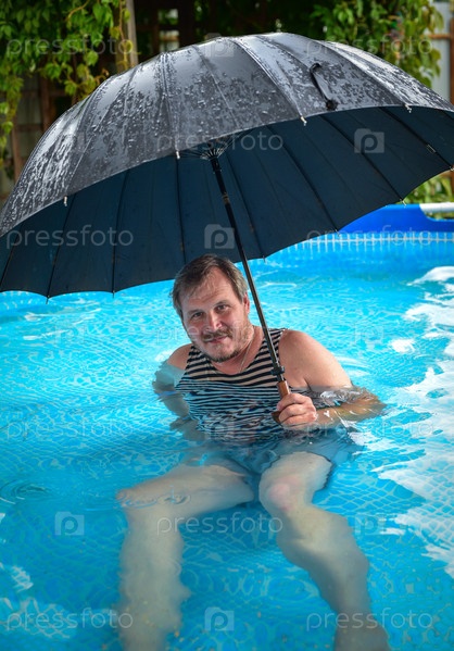 Мужчина купается в бассейне во время дождя с зонтом