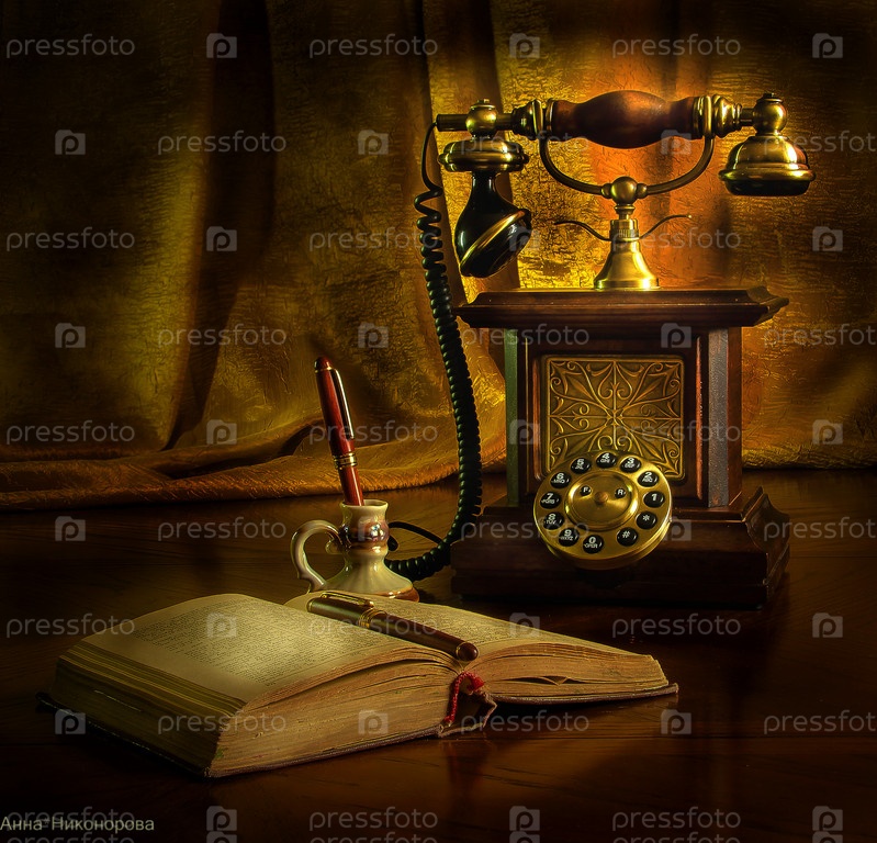Винтажный натюрморт - стариный телефон ретро, книга и ручка