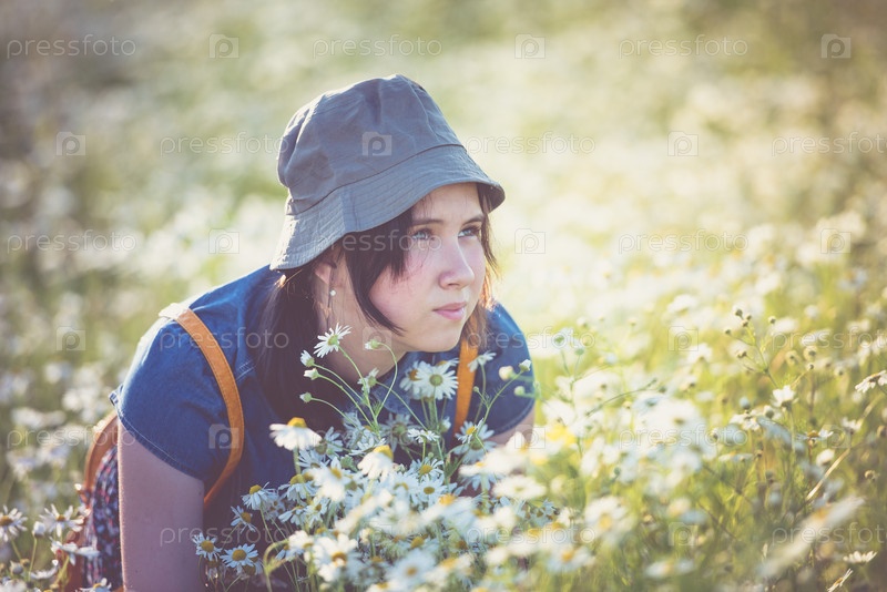 Красивая молодая девушка сидит на ромашковом поле — летняя фотография в контровом свете, солнечно