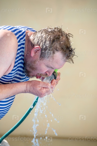 Мужчина пьет воду из шланга в жаркий день