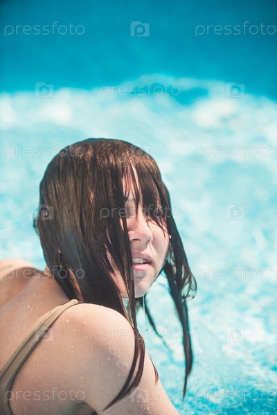 Молодая девушка смеется в брызгах воды в бассейне