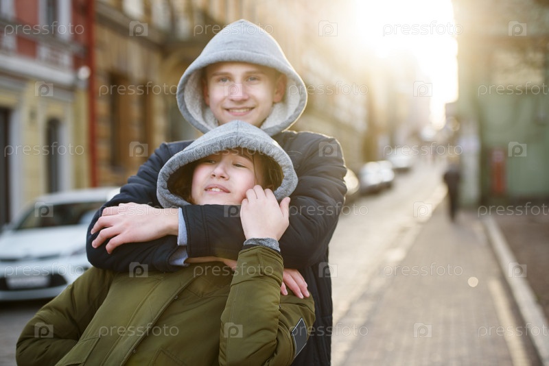 Мальчик и девочка-подросток на улице древнего города в красном свете заката