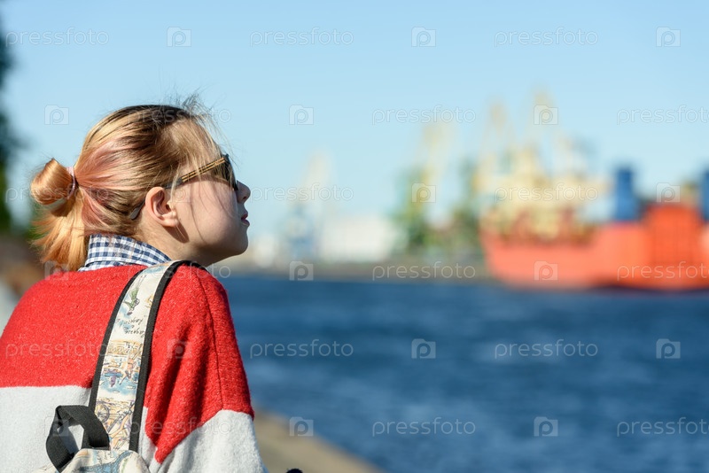 Девушка в одиночестве в торговом порту на прогулке. Россия, Санкт-Петербург, 30 мая 2020 г
