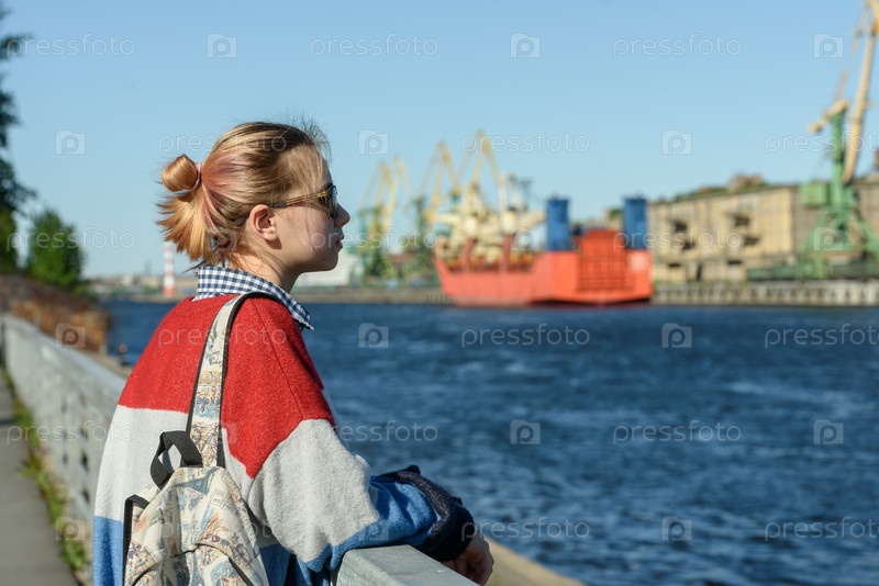 Девушка в одиночестве в торговом порту на прогулке. Россия, Санкт-Петербург, 30 мая 2020 г