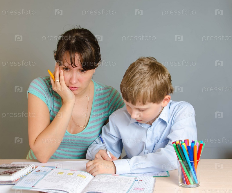 Мама и сын делают домашнее задание