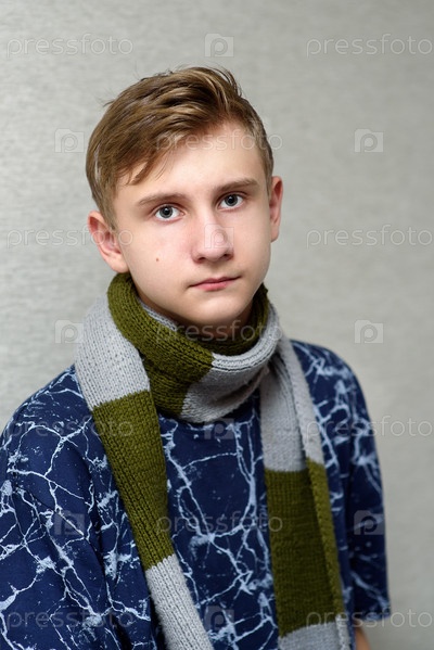 Портрет мальчика с шарфом на шее дома — грустный взгляд, болезненный вид