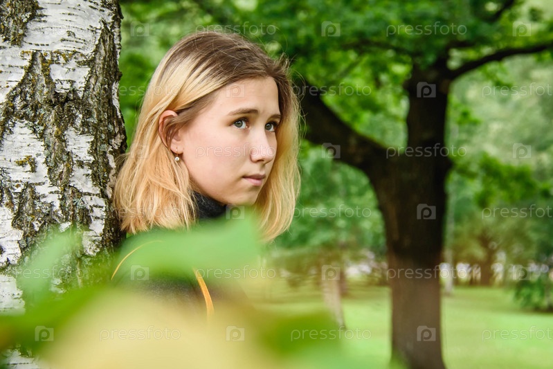 Портрет молодой девушки у березы в лесу-крупный план