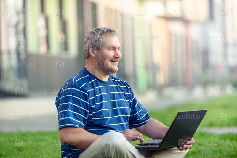 Счастливый человек сидит на лужайке в городе с ноутбуком. Современной городской жизни
