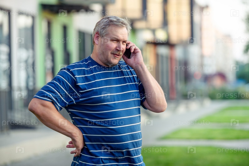 Мужчина с удовольствием разговаривает по смартфону, идя по улице