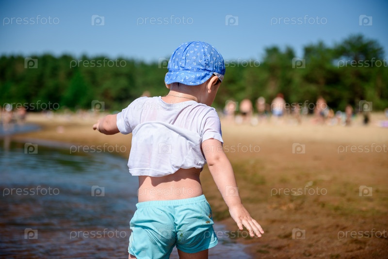 Маленький ребенок мальчик на пляже у большого озера