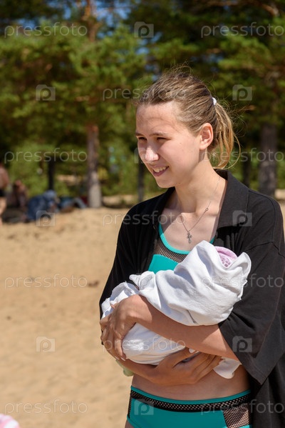 Молодая мать с младенцем на пляже у озера летом
