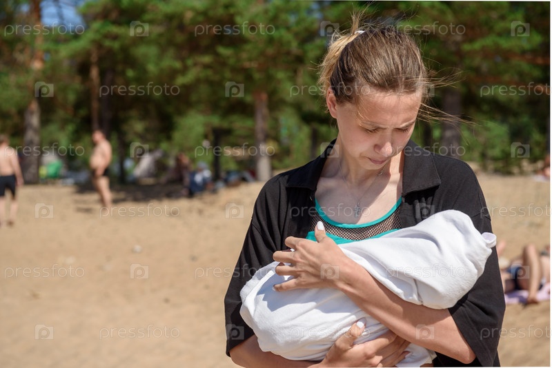 Молодая мать с младенцем на пляже у озера летом