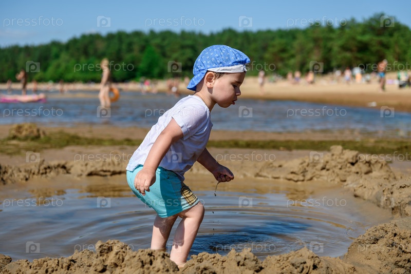 Маленький ребенок мальчик на пляже у большого озера