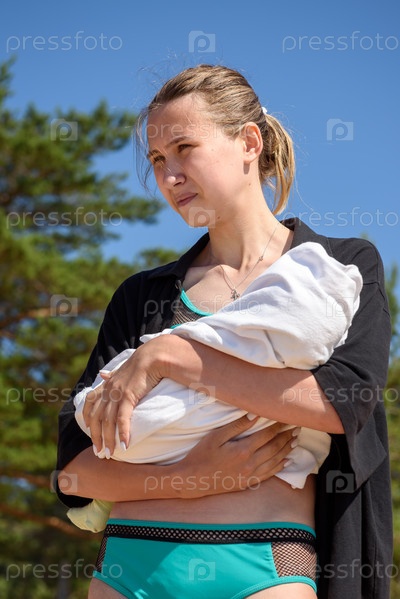 Молодая мать с младенцем на пляже у озера летом