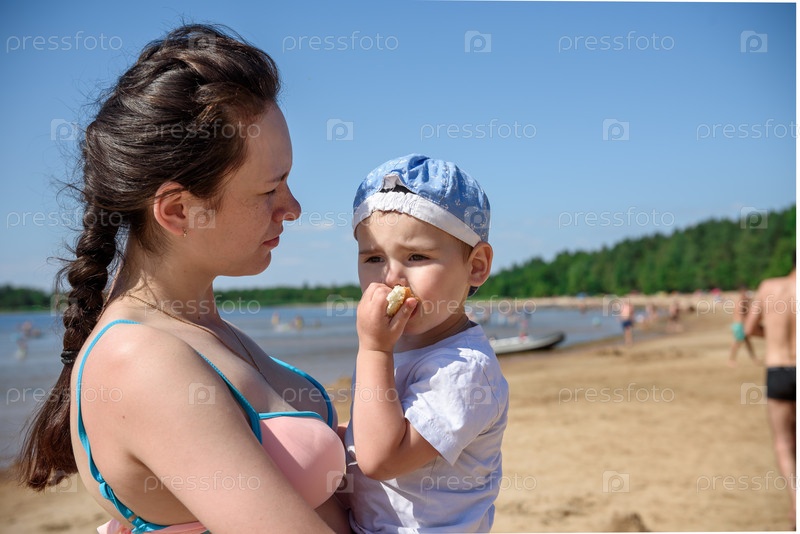 Молодая мать с ребенком на пляже у озера летом
