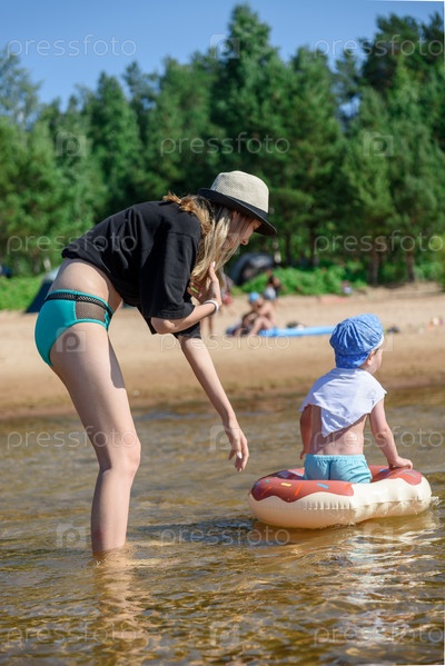 Маленький ребенок мальчик с мамой на пляже у озера