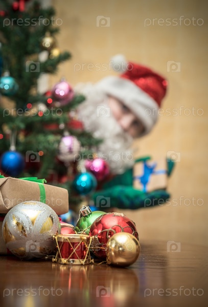 Мальчик одетый в деда мороза кладет подарки под елку в Новый Год