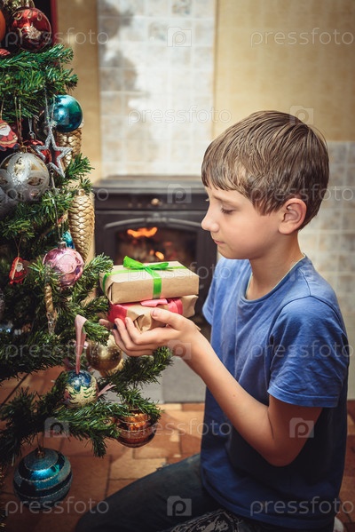 Мальчик находит свой подарок под новогодней елкой