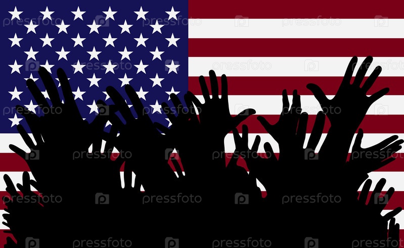 Руки вверх силуэты на флаге Америки. Толпа фанатов футбола, игр, веселых людей на вечеринке. Векторный баннер, карта, плакат