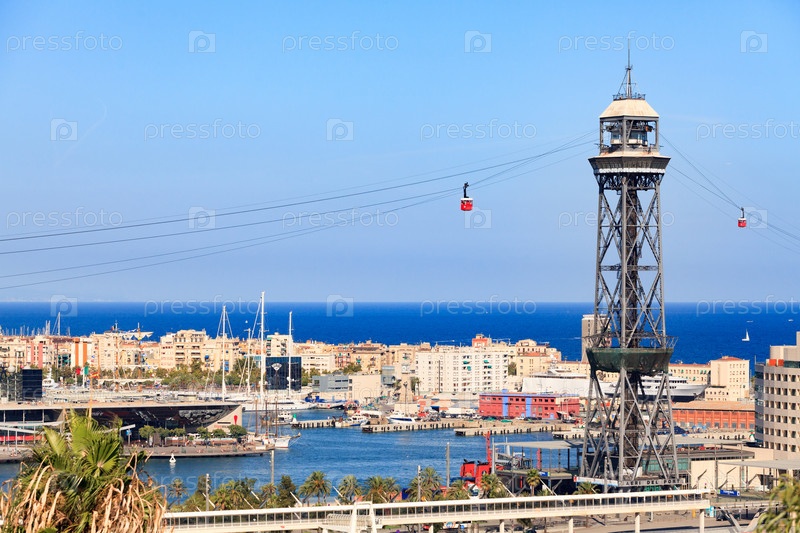 15 сентября 2011 г. Барселона, Испания: башня канатной дороги на фоне города Барселона и яхт-порта