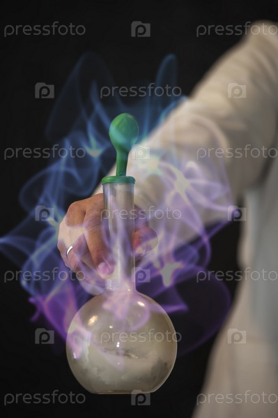 Рука ученого держит колбу с химическим веществом на фоне магического свечения