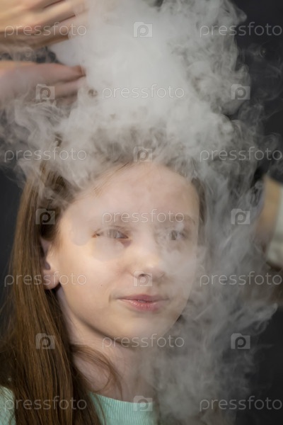 Ребенок — участник научных экспериментов. Девочка в дыму жидкого азота